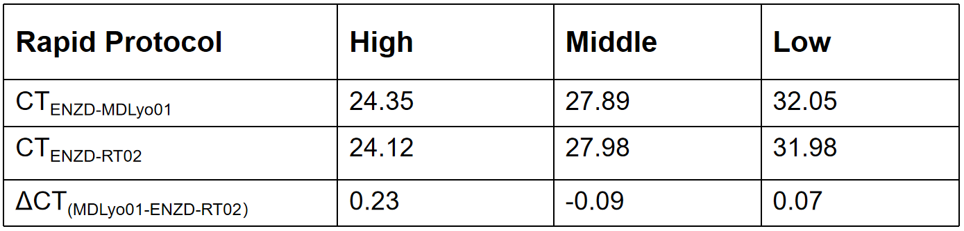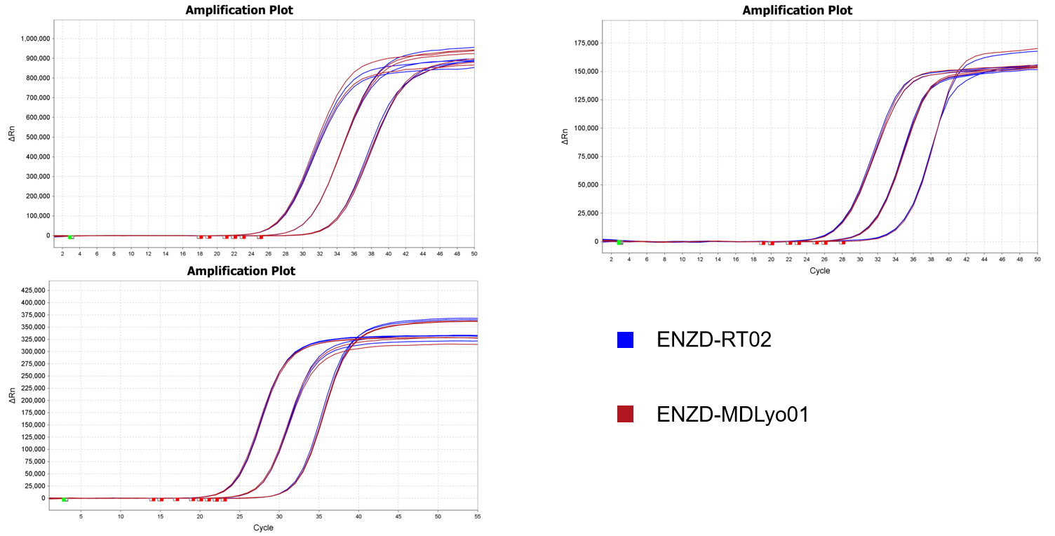 The performance of ENZD-MDLyo01 was evaluated under a rapid amplification protocol and compared with a reference reverse transcriptase (ENZD-RT02) across high-, medium-, and low-template input levels. Data generated from internal validation studies, demonstrating comparable performance between ENZD-MDLyo01 and reference enzyme under rapid amplification conditions.