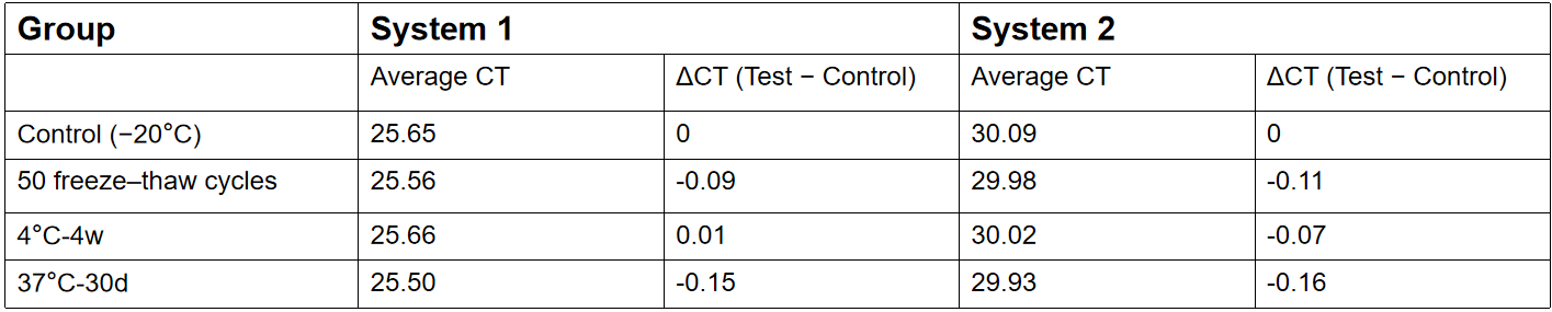 The stability of ENZD-MDLyo01 was evaluated under multiple stress conditions, including repeated freeze–thaw cycles, long-term refrigerated storage, and elevated temperature exposure. Performance was assessed by comparing Ct values across two reaction systems, using a −20°C stored sample as the reference.