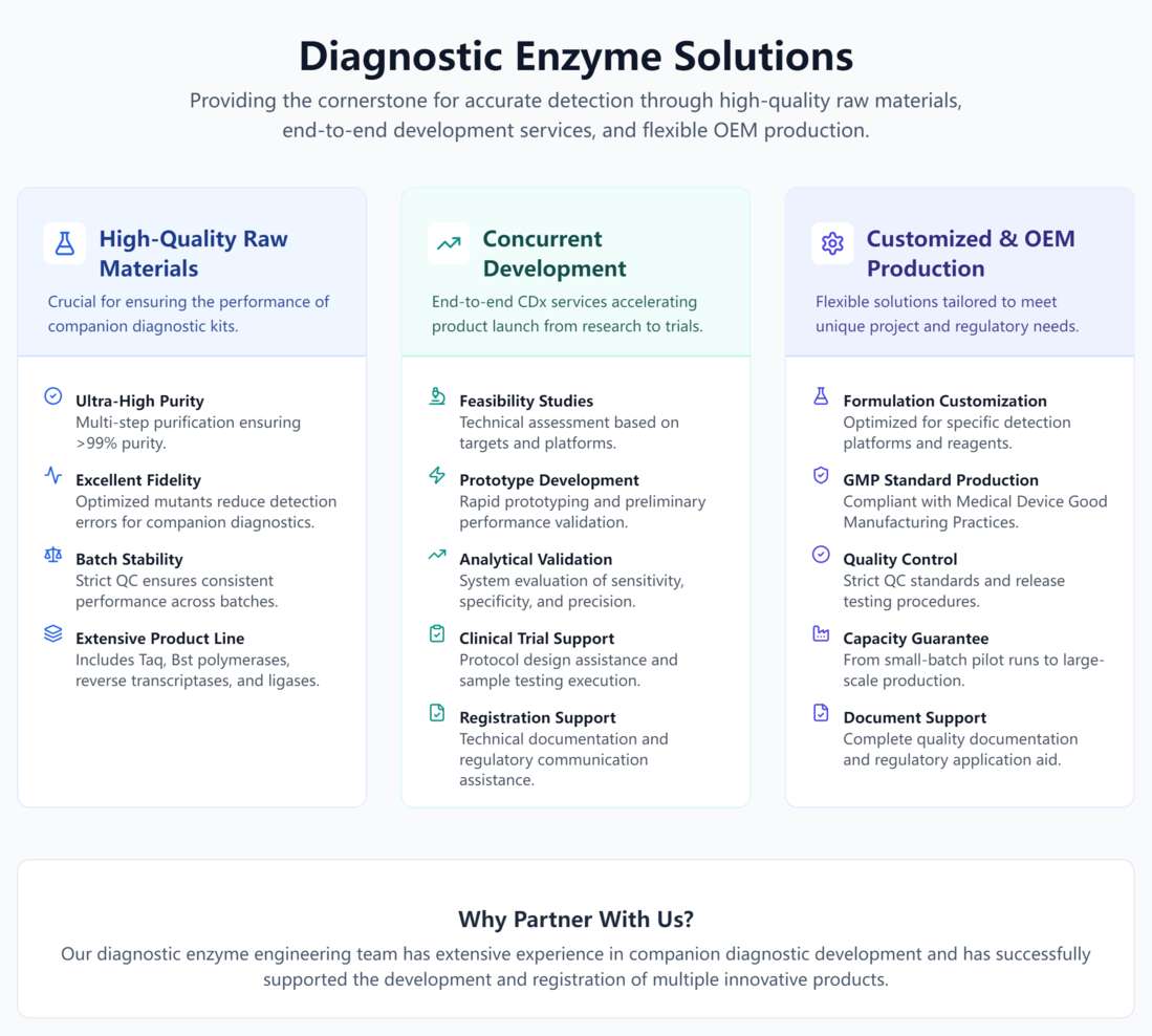 Our core value lies in building a technological bridge from core enzymes to complete companion diagnostic kits. By optimizing enzyme performance and improving detection sensitivity and specificity, we help our partners accelerate product development and ensure the reliability and stability of their diagnostic kits. Against the backdrop of the rapid development of precision medicine globally, we remain committed to promoting the innovation and application of companion diagnostic technologies.
