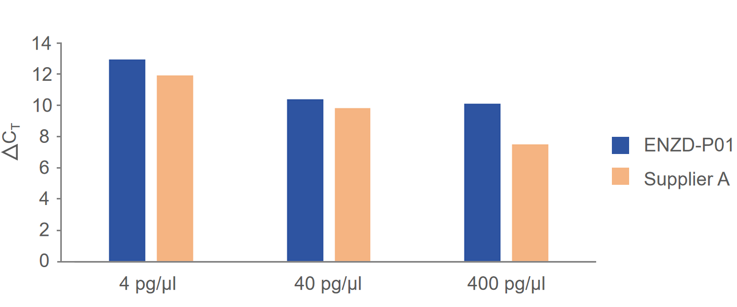 Evaluated using three concentrations of dU-containing templates, ENZD-P01 was tested in parallel with Supplier A, using a no-UDG control as reference. As a diagnostic grade UDG, ENZD-P01 demonstrated stronger clearance capability under identical template concentrations, more effectively removing non-template DNA contamination from the system.Data sourced from internal validation studies, supporting the consistency and purity of the enzyme performance.