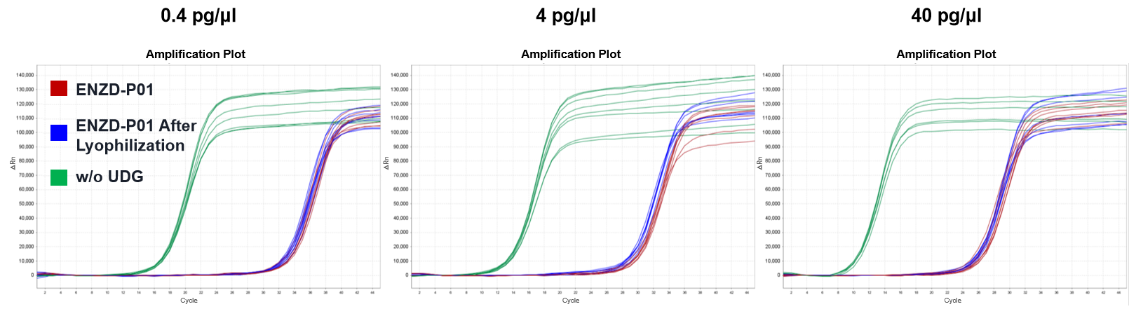 Performance was assessed across different concentrations of uracil-containing templates before and after lyophilization of ENZD-P01. Results showed that, compared with the no-UDG control, the enzyme effectively degraded templates both before and after freeze-drying, with consistent amplification performance. Data sourced from internal validation studies, confirming stable performance and high purity after lyophilization.