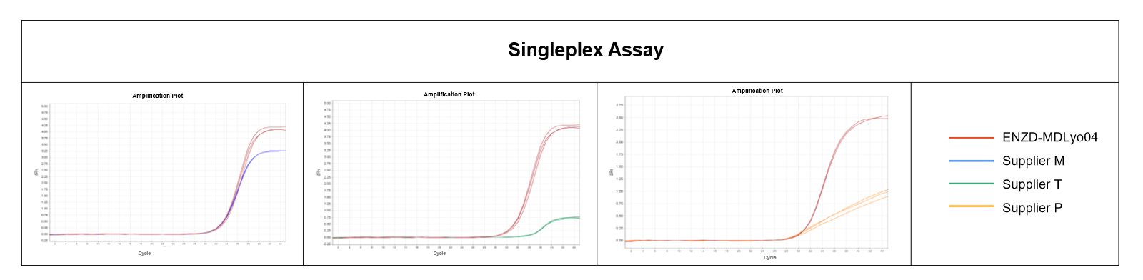 Under identical experimental conditions, ENZD-MDLyo04 demonstrated comparable or superior performance to leading reference products, maintaining stable amplification signals across all detection channels. The observed performance ranking (ENZD-MDLyo04 ≈ Supplier M > Supplier T > Supplier P) highlights its strong compatibility with complex multiplex systems.