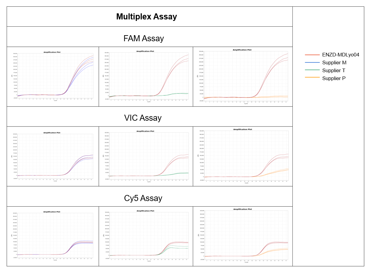 To assess system compatibility, ENZD-MDLyo04 was evaluated in multiplex qPCR assays across three fluorescence channels (FAM, VIC, and CY5) and compared with multiple commercial reference reagents.